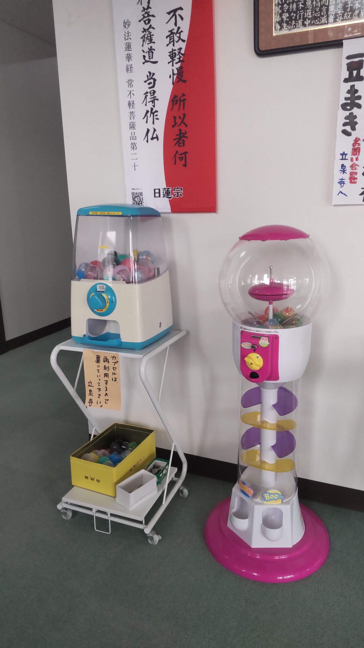 玄関を入るとガチャガチャがあります。子供用、大人用の二つがあり、それぞれおみくじがカプセルに入っています。お参りに来た人は無料でできます。